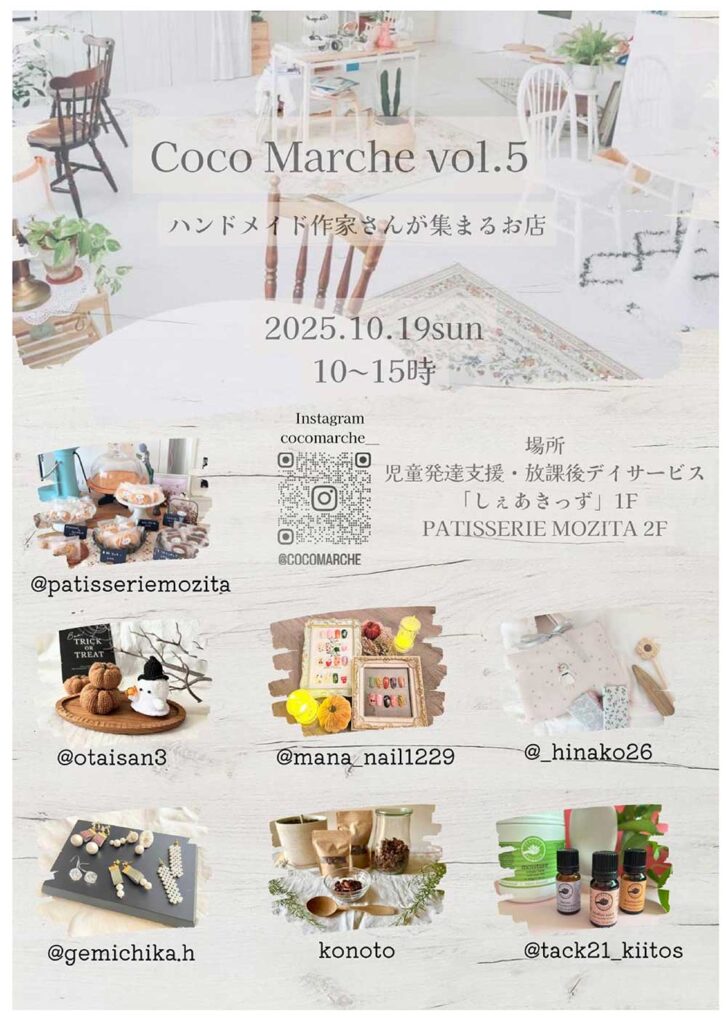 Home › お知らせ › CoCo Marche vo.5 ハンドメイド作家さんが集まるお店2025-09-27CoCo Marche vo.5 ハンドメイド作家さんが集まるお店CoCo Marche vo.5 ハンドメイド作家さんが集まるお店開催日:2025年10月19日(日)10:00~15:00場所:児童発達支援・放課後デイサービス「しぇあきっず」1F/PATISSERIE MOZITA 2Fタグ: 2025年, お知らせ関連記事 しぇあきっず水害対策訓練を行いました 風水害時の避難訓練を実施ました(訪看・しぇあきっず) 防災訓練を行いました(しぇあーど しぇあきっず) オールキッズフェスタひょうご 5月18日に全体会議と防災に関する訓練が行われました遊び心を広げるモノづくり ~こどもの想いに寄り添って~オールキッズフェスタひょうご